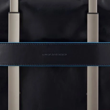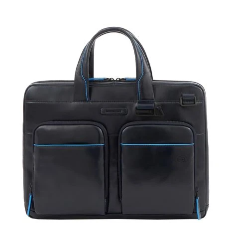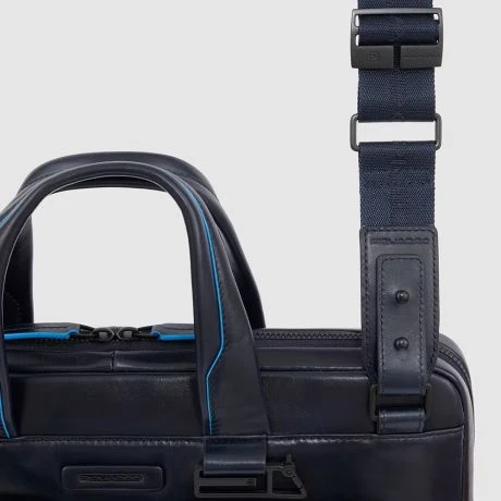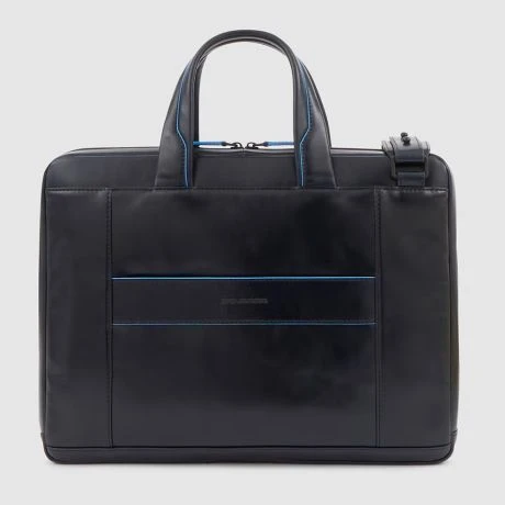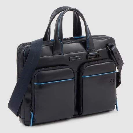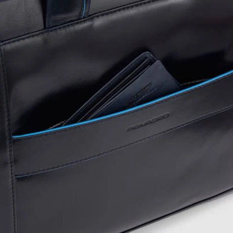 Luxe lederen laptoptas uit de nieuwe Blue Square Revamp serie van Piquadro. Met Blue Square Revamp zijn de beste modellen uit de Blue Square serie sportiever van uitstraling dankzij de minder felle blauwe randen en is alle hardware, waaronder de rits en de ritspullers in prachtig mat zwart. Deze slanke laptoptas bevat een ruim hoofdcompartiment met ruimte voor een 14″ laptop en een 12.9″ iPad/Tablet. Verder bevat de tas een groot voorvak, twee kleine georganiseerde voorvakjes en achterop een ritsvak.