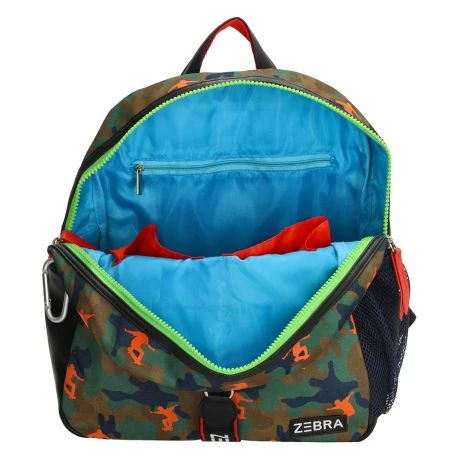 Stoere kinderrugtas van Zebra. De rugzak heeft een coole stijl en is te sluiten door middel van een stevige rits, bevat een handvat en verstelbare schouderbanden. Ook is de tas voorzien van een ritsvak met sleutelhanger voorop de tas en twee drinkbekervakken aan de binnenkant. Op de voorzijde zit een vak met een verticale rits, de rits is voorzien van sleutelhanger. Aan de ene zijkant een ring voor sleutels, aan de andere zijkant een netvak voor een drinkflesje. De rugtas is geschikt voor kinderen om mee te nemen naar de basisschool. De rugtas is gemaakt voor kinderen van ongeveer 4 t/m 8 jaar.
